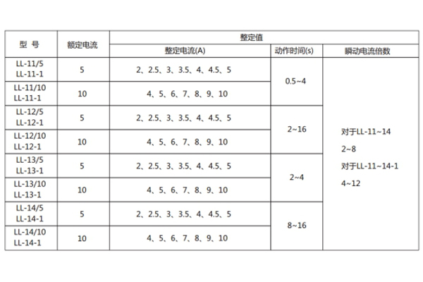 注:特殊規(guī)格LL-10-1(11-1、12-1、13-1、14-1)瞬動電流倍數(shù)4-12,其余參數(shù)與LL-10系列對應(yīng);繼電器的電流線圈允許長期通過