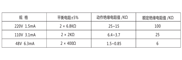 繼電器動作值:當母線任何一側對地絕緣電阻下降到下表規定值時,繼電器應可靠動作。